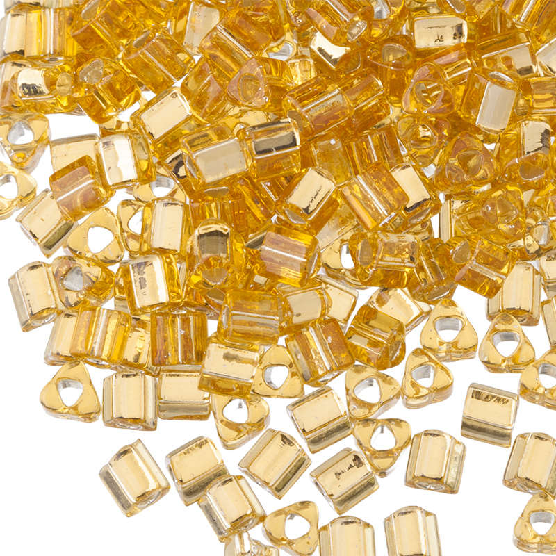 Японский бисер TOHO — треугольный (TOHO triangles), размер 8/0 (высота 3 мм). Отверстие 1 мм. Цвет #123 (Silver-Lined Medium Topaz, внутреннее серебрение, топаз). Цена указана за 10 грамм (примерно 250 шт).