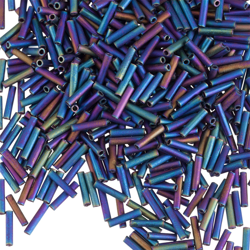 Японский бисер MIYUKI Slender Bugle — стеклярус классической формы тонкий (стекло). Цвет: #401FR (полупрозрачный черный), эффект: Matte AB (матовый радужный). Обратите внимание: из—за особенностей покрытия итоговый цвет — радужный с основным переходом от фиолетового к голубому. Длина: 6 мм, диаметр: 1,3 мм, отверстие: 0,7 мм. Цена указана за 10 грамм (примерно 720 шт).