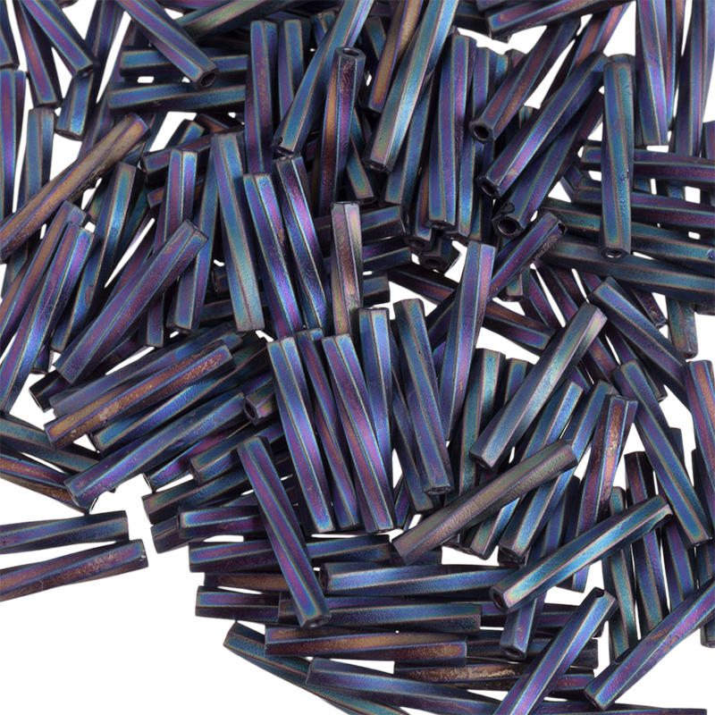 Японский бисер MIYUKI Twisted Bugle — витой стеклярус (стекло). Цвет: #401FR (полупрозрачный черный), эффект: Matte AB (матовый радужный). Обратите внимание: из-за особенностей покрытия итоговый цвет — радужный с основным переходом от фиолетового к голубому. Длина: 12 мм, диаметр: 2 мм, отверстие: 0,7 мм. Цена указана за 10 грамм (примерно 90 шт).