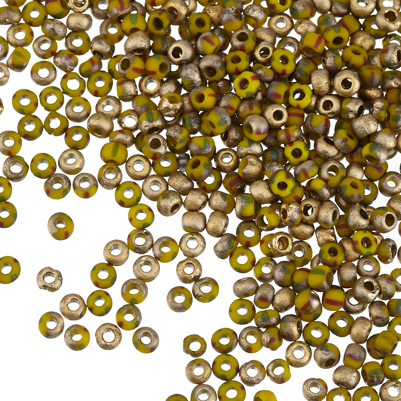 Чешский круглый бисер Preciosa Czech 8/0 (стекло). Цвет: #83150M-26481 (Aged Yellow Etched Amber Red & Green Stripe, матовый, состаренный желтый с зелеными и красными полосками/золото), покрытие: Etched (шершавое стекло). Размер: 2.9 x 2 мм, отверстие: 1 мм. Производство: Чехия. Цена указана за 10 грамм (примерно 550 штук).