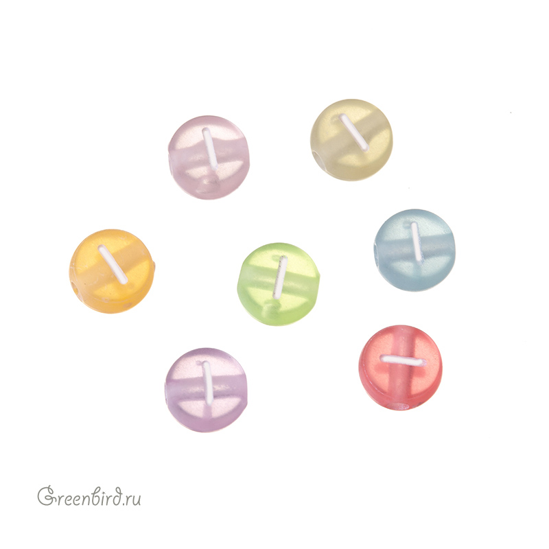 Бусины с буквами пластиковые. Цвет: в ассортименте; печать рисунка: белый. Размер: 6,7 х 7 мм, толщина: 4,1 мм, отверстие: 1,6 мм. Обратите внимание: это микс из разноцветных бусин. Вы получите бусину случайного цвета. Производство: Китай. Цена указана за 1 шт.