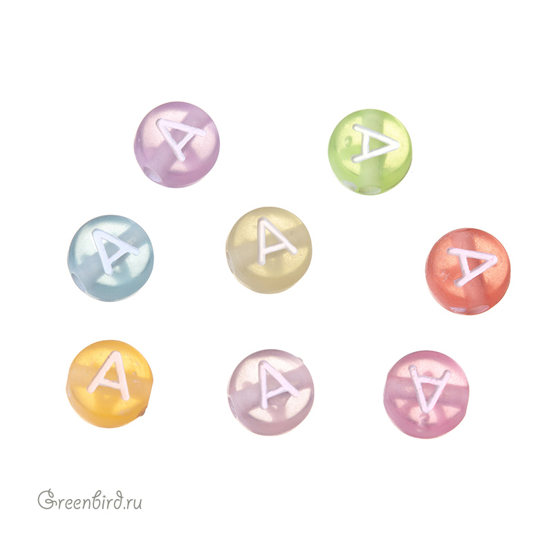 Бусины с буквами пластиковые. Цвет: в ассортименте; печать рисунка: белый. Размер: 6,7 х 7 мм, толщина: 4,1 мм, отверстие: 1,6 мм. Обратите внимание: это микс из разноцветных бусин. Вы получите бусину случайного цвета. Производство: Китай. Цена указана за 1 шт.