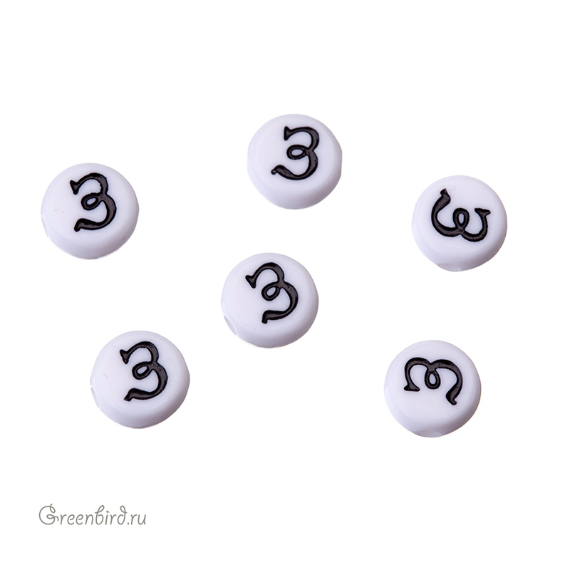 Бусины с буквами (кириллица) пластиковые. Цвет: белый; печать рисунка: черный. Размер: 6,8 х 7 мм, толщина: 3,5 мм, отверстие: 1,6 мм. Производство: Китай. Цена указана за 1 шт.