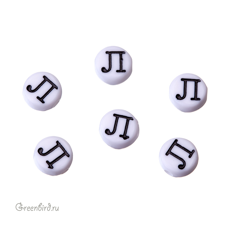 Бусины с буквами (кириллица) пластиковые. Цвет: белый; печать рисунка: черный. Размер: 6,8 х 7 мм, толщина: 3,5 мм, отверстие: 1,6 мм. Производство: Китай. Цена указана за 1 шт.