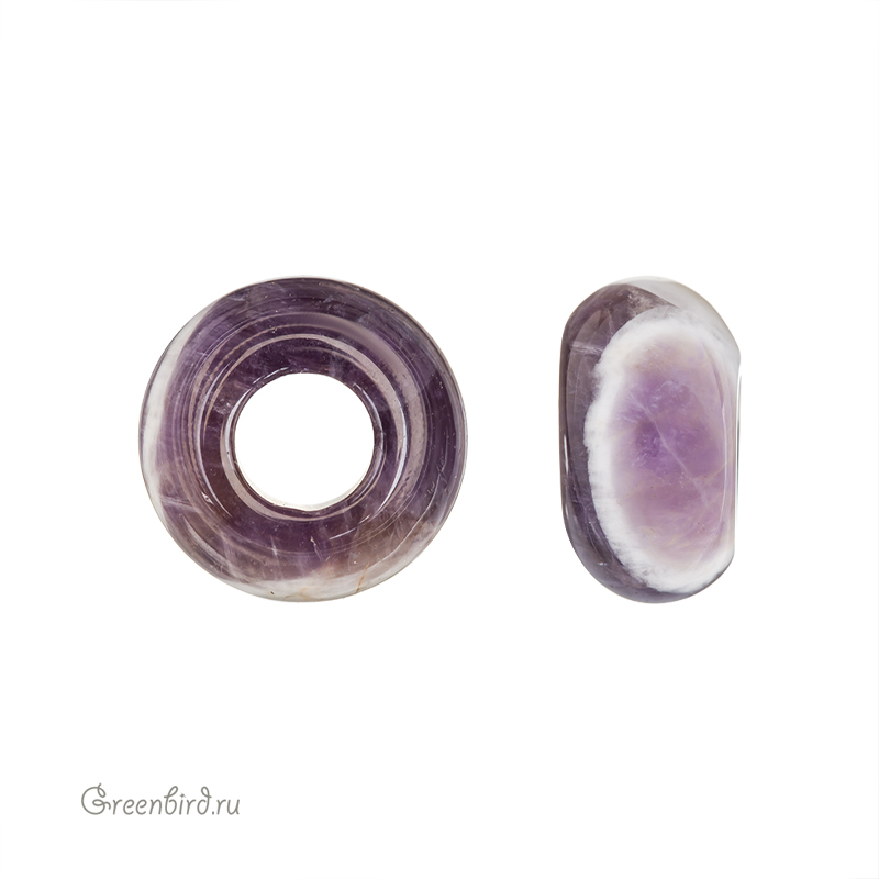 Бусина-шарм (Charm Bead) из поделочного камня, аметист. Цвет: аметистово-фиолетовый с прожилками белого или светло-коричневого цвета. Характерны полупрозрачные включения или крупные участки. Диаметр: 13,8-14,1 мм, высота: от 6,8 мм до 7,6 мм, отверстие: 5,6-5,8 мм. Размеры могут незначительно отличаться. Возможно наличие мелких сколов или каверн. Из-за природных особенностей бусины отличаются по рисунку, вы получите бусину случайного вида. Производство: Китай. Цена указана за 1 шт.