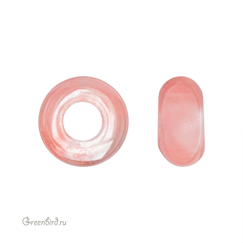 Бусина-шарм (Charm Bead) из поделочного камня, кварц прозрачный окрашенный. Цвет: полностью прозрачный или очень бледный теплый розовый с характерными включениями и волокнами выраженного рыжевато-розового цвета. Допускаются внутренние трещины и небольшие темные включения. Диаметр: 13,7-13,8 мм, высота: 6,8-7,1 мм, отверстие: 5,4-5,7 мм. Бусины этого сорта имеют более неровную и разнообразную форму. Возможно наличие характерных трещин и сколов на поверхности, преимущественно возле отверстия. Из-за природных особенностей бусины отличаются по рисунку, вы получите бусину случайного вида. Производство: Китай. Цена указана за 1 шт.