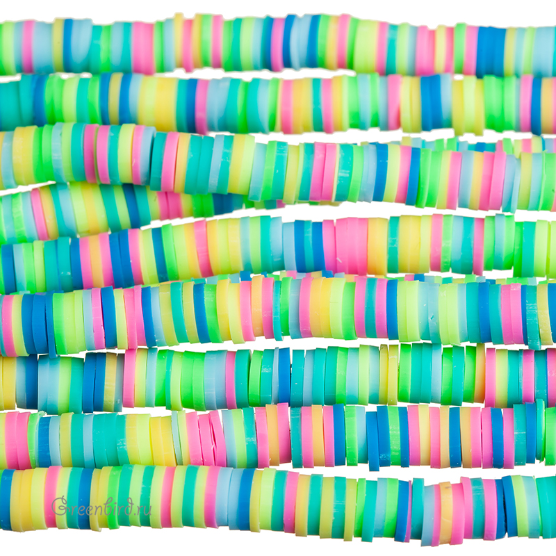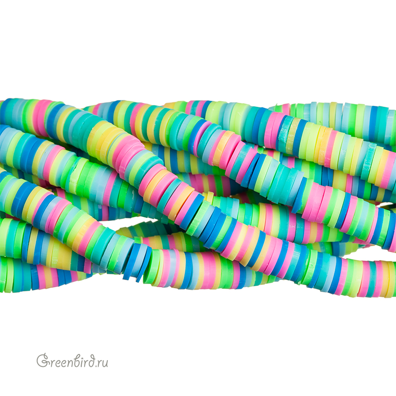 Легкие и гибкие цветные бусины в форме дисков. Материал: резина (каучук). Цвет: неоновое диско, микс желтого, зеленого, бирюзового, синего, голубого и розового. Диаметр: 5,6-6,05 мм, толщина: 0,8-1,1 мм, отверстие примерно 1,8 мм. Размеры могут незначительно отличаться. Производство: Китай. Цена указана за нить 40 см (примерно 350 штук).