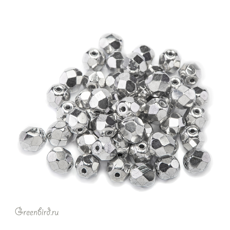Граненые бусины (стекло). Цвет: #27000CR (серебряный). Размер: 6 мм, отверстие: 1 мм. Производство: Чехия. Цена указана за 13 грамм (примерно 50 штук).