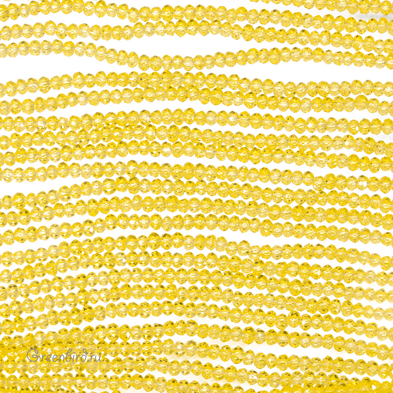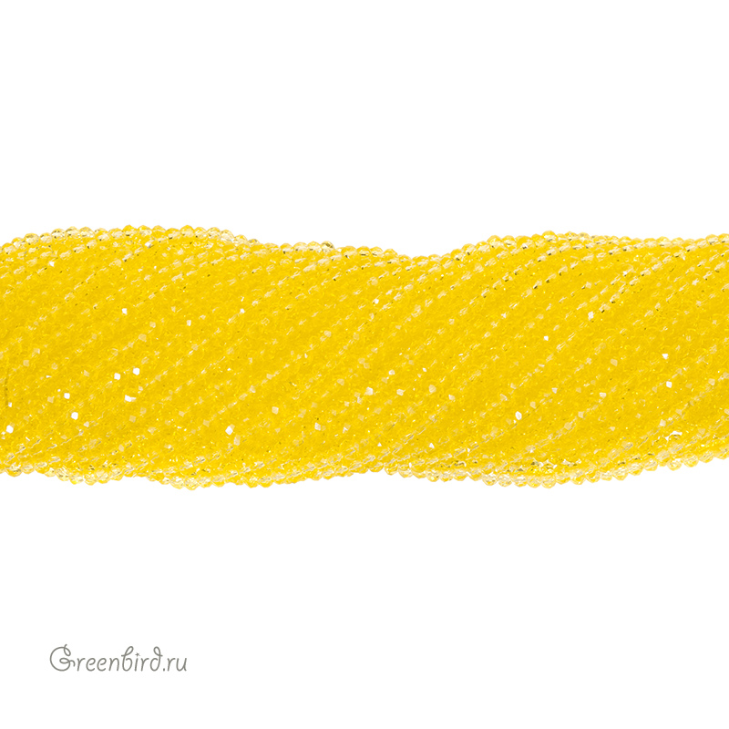 Бусины граненые Rondelle. Материал: стекло. Цвет: желтый. Размер: от 2,3 х 1,5 мм до 2,6 х 1,9 мм, отверстие: 0,5-0,6 мм. Цена указана за нить 31-32 см (примерно 130 штук).