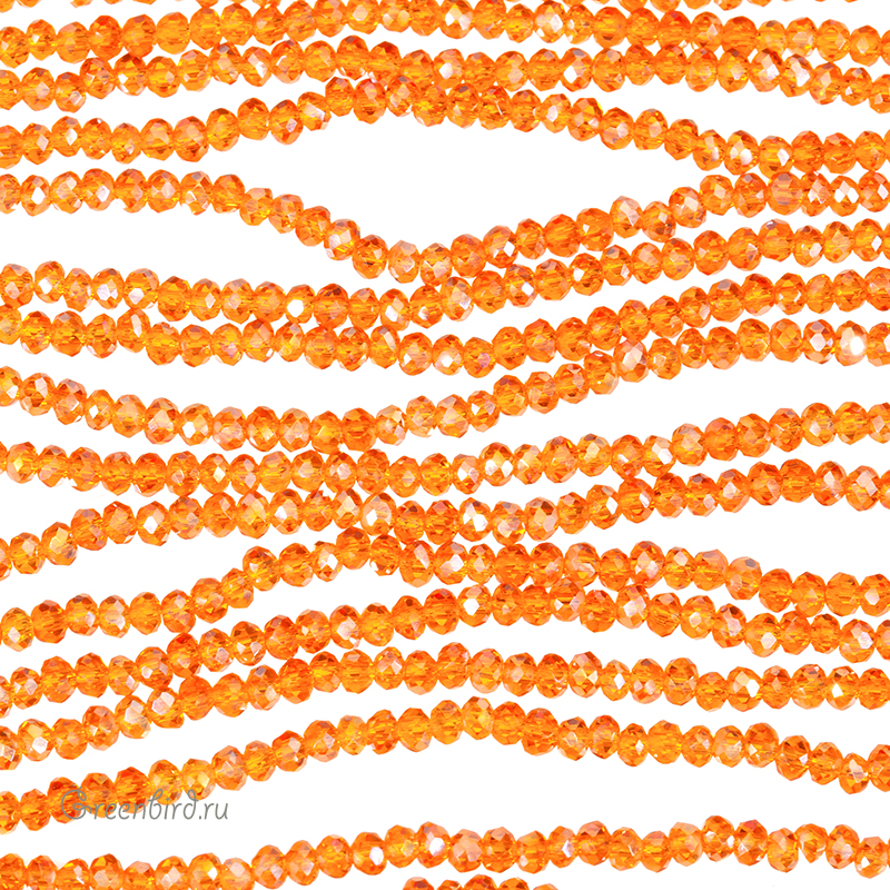 Бусины граненые Rondelle. Материал: стекло. Цвет: мандариново-оранжевый (прозрачный); покрытие: Aurore Boreale, радужный эффект (полупрозрачное переливающееся напыление, нанесено на поверхности граней бусины в разных пропорциях). В зависимости от партии интенсивность радужного эффекта и его оттенок могут отличаться. Размер: от 2,9 х 1,95 мм до 3,1 х 2,25 мм, отверстие: 0,5-0,6 мм. Цена указана за нить (примерно 180 штук).