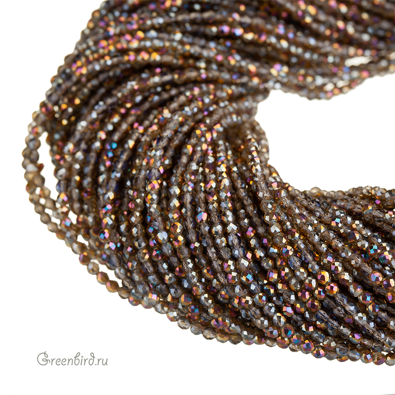 Бусины граненые Rondelle. Материал: стекло. Цвет: бежевый или серый (прозрачный), покрытие: розовый металлик с радужным эффектом (частичное, эффект AB различной интенсивности). Допускается наличие бусин с частично стертым покрытием. Размер: от 2,3 х 2,2 мм до 2,4 х 2,4 мм, отверстие: 0,5-0,6 мм. Обратите внимание: бусины этого сорта могут быть более округлыми или слегка сплюснутыми (форма Rondelle). Цена указана за нить (примерно 130 штук).