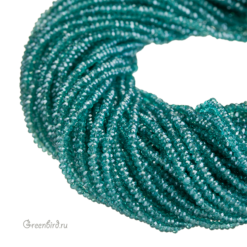 Бусины граненые Rondelle. Материал: стекло. Цвет: приглушенный бирюзово-зеленый (прозрачный), покрытие: серебристый перламутр (полное, полупрозрачное). Размер: от 2,3 х 1,5 мм до 2,6 х 1,8 мм, отверстие: 0,5-0,6 мм. Цена указана за нить (примерно 140 штук).