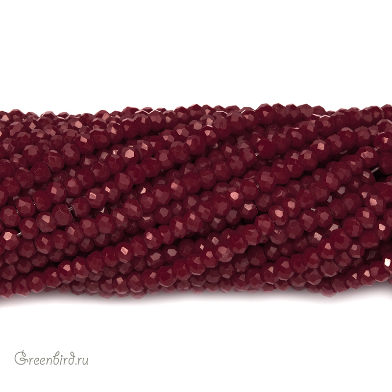 Бусины граненые Rondelle. Материал: стекло. Цвет: темно-красный (непрозрачный) с эффектом Fire Polished (отполированные бусины), без покрытия. Размер: от 2,3 х 1,7 мм до 2,6 х 1,8 мм, отверстие: 0,5-0,6 мм. Цена указана за нить (примерно 140 штук).