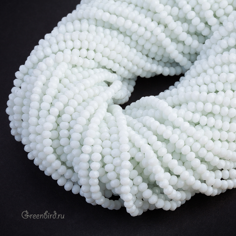 Бусины граненые Rondelle. Материал: стекло. Цвет: алебастр (белый, практически непрозрачный). Размер: от 4,3 х 3,3 мм до 4,6 х 3,7 мм, отверстие: 0,6-0,7 мм. Цена указана за нить (примерно 145 штук).