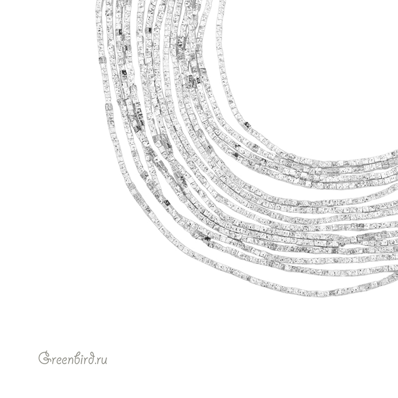 Из-за особенностей нанесения цветного металлизированного покрытия в нитях может присутствовать склеенность некоторых бусин, неоднородность и пористость покрытия в местах соприкосновения бусин, а также небольшие потертости.
