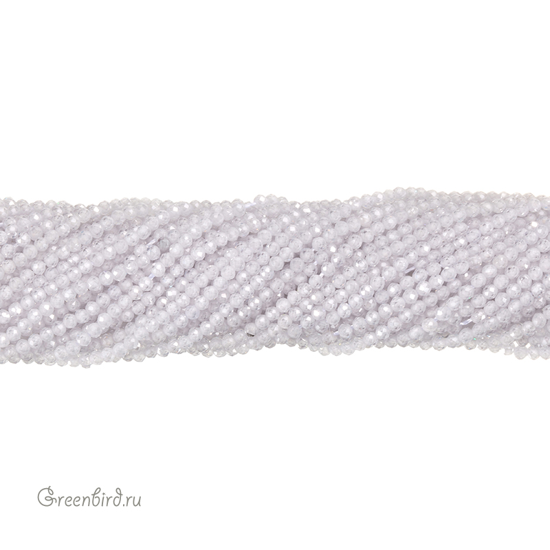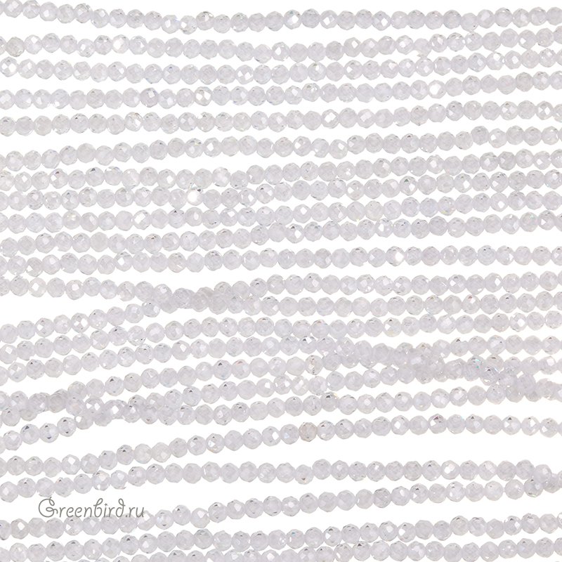 Бусины Циркон (фианит или кубический цирконий) ювелирной огранки. Материал: синтетический камень. Цвет: белый (прозрачный). Размер: 2 х 1,9 мм, диаметр отверстия: 0,5 мм. Производство: Китай. Цена указана за нить 37-38 см (примерно 204 штуки).