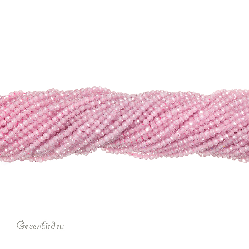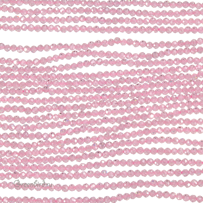 Бусины Циркон (фианит или кубический цирконий) ювелирной огранки. Материал: синтетический камень. Цвет: бледно-розовый (прозрачный). Размер: 2 х 1,9 мм, диаметр отверстия: 0,5 мм. Производство: Китай. Цена указана за нить 37-38 см (примерно 204 штуки).