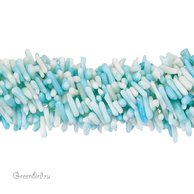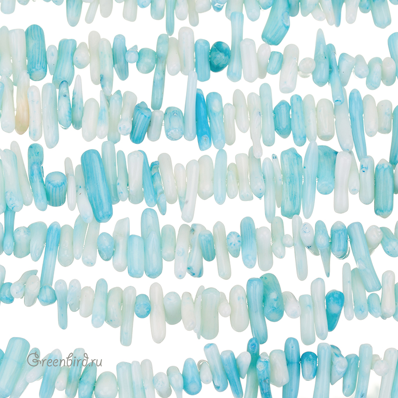 Коралл натуральный, окрашенный, необработанный - мелкие кусочки, по форме напоминающие неоднородные палочки. Размер примерно от 5 мм до 19 мм, толщина примерно от 1,8 до 3,5 мм, отверстие: 0,6 мм. Цвет: голубой с белым. Цена указана за нить 39-40 см.