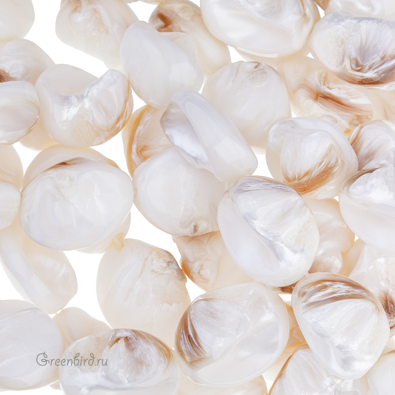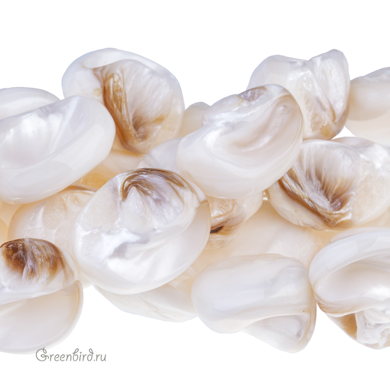 Перламутр натуральный – крупные кусочки из раковин, с завитками. Размер примерно от 14,2 х 18,1 х 23,6 мм до 16,7 х 22,7 х 28,8 мм (могут незначительно отличаться в одном из измерений), отверстие: 1,4-1,8 мм. Цвет: белый с коричневым/золотисто-коричневым, с выраженной характерной опалесценцией. Из-за природных особенностей материала размеры и форма бусин из перламутра могут значительно отличаться, при заказе вы получите бусину случайной формы. Цена указана за 1 шт.