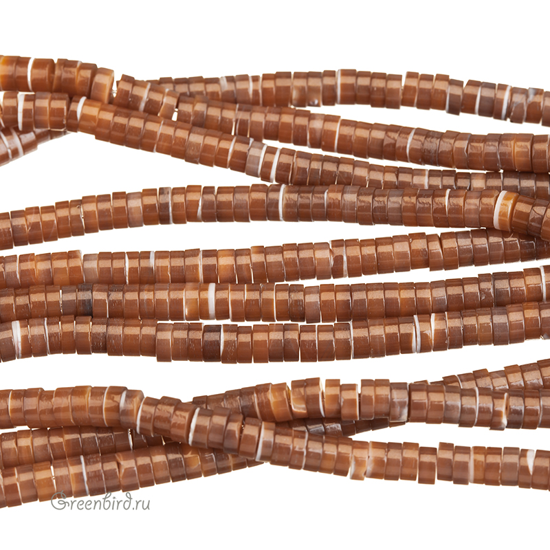 Бусины из натурального перламутра в форме диска. Цвет: коричневый с переливами, с белыми прожилками. Размер примерно: 4,5 мм, толщина: 1,7 - 2 мм, отверстие: 0,6 мм - 1 мм. Обратите внимание: из-за природных особенностей материала размеры и оттенки бусин могут незначительно отличаться. Так же возможны неровности на краях и поверхности бусин, которые могут выглядеть как сколы или вмятины. Такие эффекты не считаются браком и являются прямым следствием природного происхождения исходного материала (эти бусины сделаны из раковин моллюсков). Цена указана за нить (примерно 220 штук).