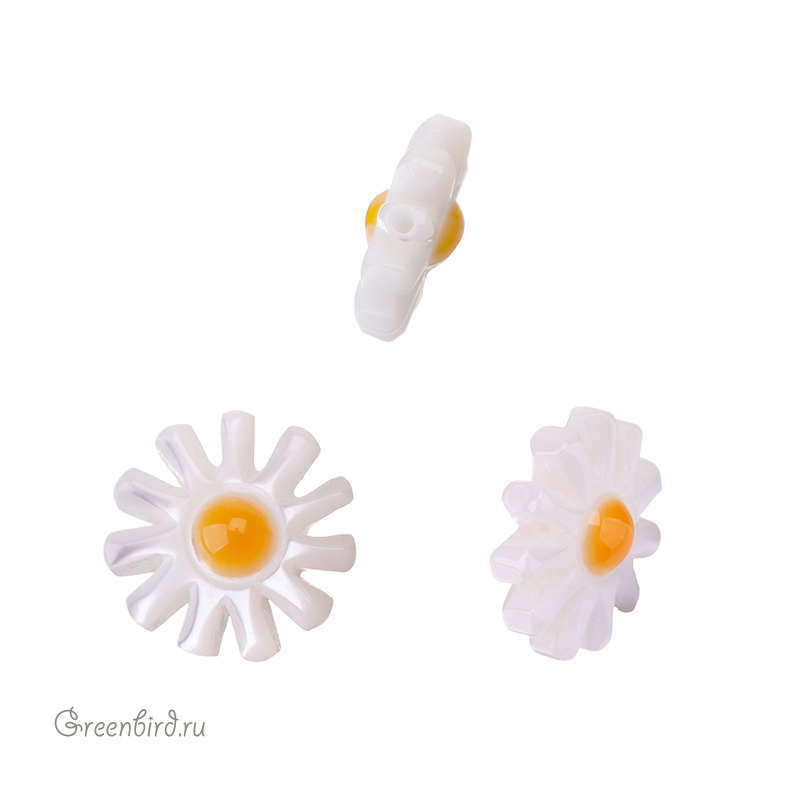 Бусина-ромашка из натурального перламутра с эмалью. Цвет: жемчужно-белый или рисовый с переливами. Размер: примерно 10,1 мм, толщина: от 4,3 мм, отверстие: 0,5 - 0,6 мм. Цена указана за 1 шт.