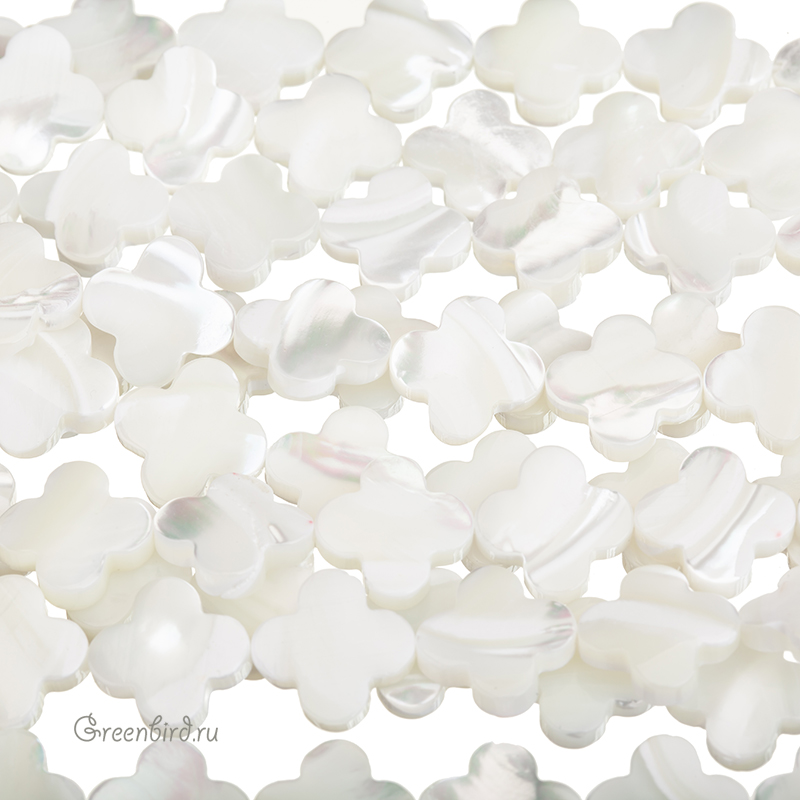 Бусины из натурального перламутра в форме клевера. Цвет: жемчужно-белый или рисовый с переливами. Возможны небольшие неровности и царапины естественного происхождения. Размер: примерно 12,3 мм, толщина: от 2,5 до 3,1 мм, отверстие: 0,6 - 0,7 мм. Из-за особенностей материала бусины незначительно отличаются по рисунку, вы получите бусину случайного вида. Цена указана за 1 шт.
