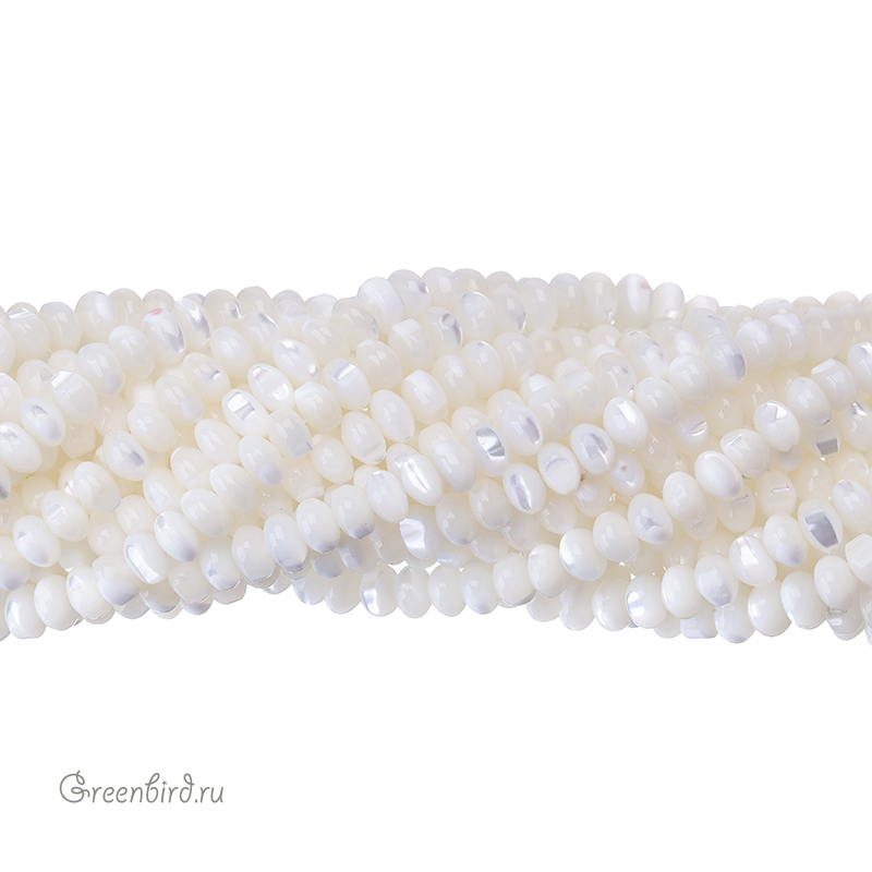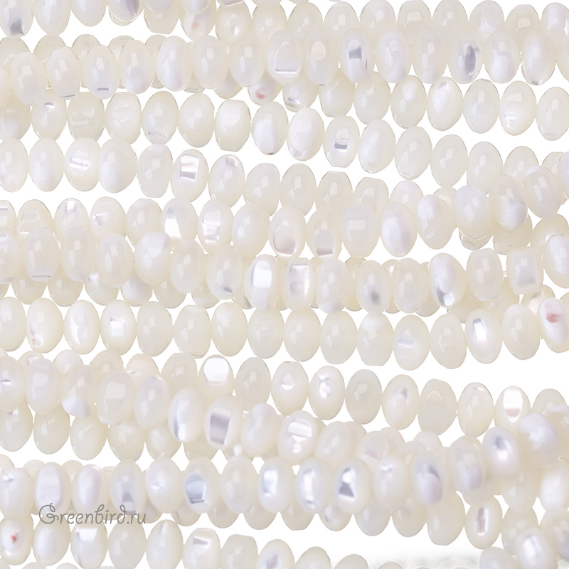 Бусины из натурального перламутра в форме сплюснутых бусин, спейсеров или кукурузных зерен. Цвет: жемчужно-белый или рисовый с переливами. Размер: 4 х 6 мм, отверстие: 0,5 мм. Обратите внимание: из-за природных особенностей материала размеры и оттенки бусин могут незначительно отличаться. Так же возможны неровности на краях и поверхности бусин, которые могут выглядеть как сколы или вмятины. Такие эффекты не считаются браком и являются прямым следствием природного происхождения исходного материала (эти бусины сделаны из раковин моллюсков). Цена указана за нить (примерно 102 штуки).