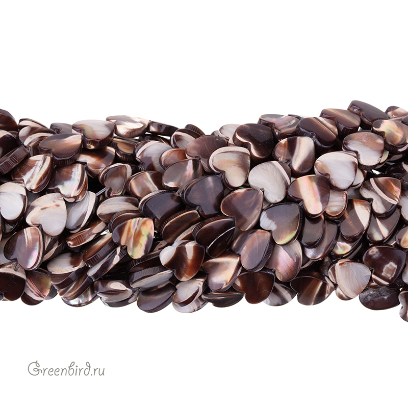 Бусины из натурального перламутра в форме сердца. Цвет: шоколадный с переливами, с белыми прожилками и вкраплениями. Размер: 10,3 х 10,4 мм, отверстие: 0,6 мм. Обратите внимание: из-за природных особенностей материала размеры и оттенки бусин могут незначительно отличаться. Так же возможны неровности на краях и поверхности бусин, которые могут выглядеть как сколы или вмятины. Такие эффекты не считаются браком и являются прямым следствием природного происхождения исходного материала (эти бусины сделаны из раковин моллюсков). Цена указана за нить (примерно 40 штук).