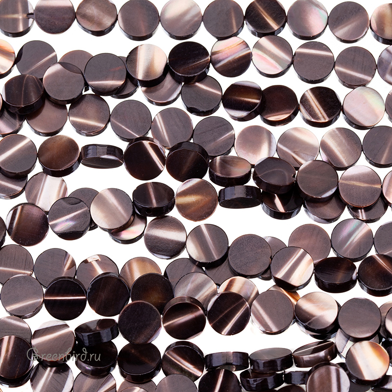 Бусины из натурального перламутра в форме таблеток. Цвет: шоколадный с переливами, с белыми прожилками и вкраплениями. Размер: 8,4 мм, толщина: 2,7 мм, отверстие: 0,6 мм. Обратите внимание: из-за природных особенностей материала размеры и оттенки бусин могут незначительно отличаться. Так же возможны неровности на краях и поверхности бусин, которые могут выглядеть как сколы или вмятины. Такие эффекты не считаются браком и являются прямым следствием природного происхождения исходного материала (эти бусины сделаны из раковин моллюсков). Цена указана за нить (примерно 46 штук).