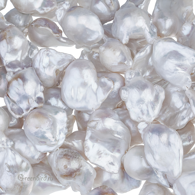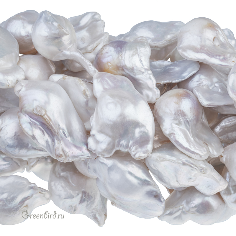 Жемчуг пресноводный культивированный (выращенный). Барочный жемчуг сложной формы с крупными вытянутыми наростами на шарике из прессованного перламутра или кости, напоминает бусину в мешочке из ткани. Возможно наличие каверн и потертостей. Диаметр основы: 13-13,5 мм, размер примерно от 19 х 14,6 х 15,5 мм для самой мелкой жемчужины, максимальный до 39 мм в длину (вдоль отверстия), 31 мм в ширину (с наростами) и до 16 мм в толщину, отверстие: 0,6-0,8 мм. Цвет: бледно-серый с выраженной в разной степени жемчужным или перламутровым блеском, присутствуют темные, коричневые и желтые пятна и переходы цвета. Из-за природных особенностей материала характеристики жемчужин могут значительно отличаться, при заказе вы получите жемчужину случайной формы. Цена указана за 1 шт.