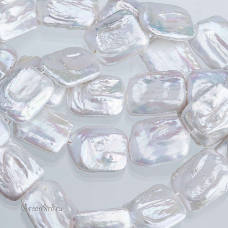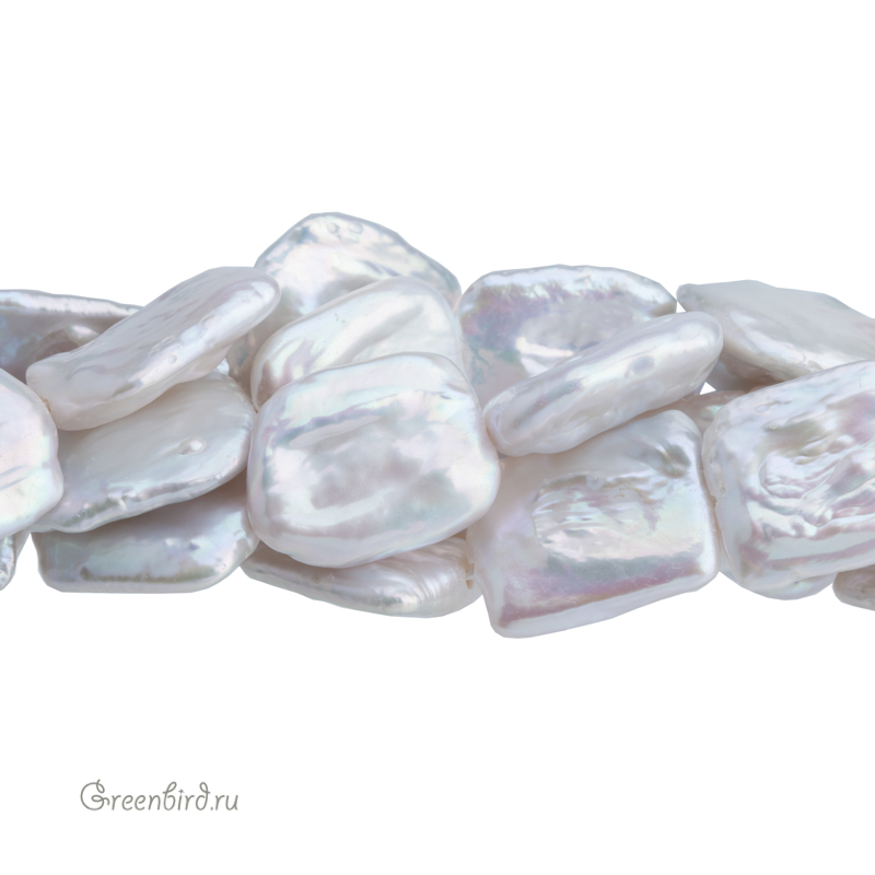 Жемчуг пресноводный культивированный (выращенный). Очень крупный барочный жемчуг, выращенный на плоских заготовках из прессованного перламутра. Может иметь каверны и пятна. Размер: от 18,3 до 22 мм вдоль отверстия, от 14,7 до 17,7 мм в ширину, толщина в среднем 5,5 мм (до 7,3 мм, не менее 3,3 мм), отверстие: 0,8-1,1 мм. Цвет преимущественно сероватый с выраженными перламутровыми переливами. При заказе вы получите жемчужину случайной формы. Цена указана за 1 шт.