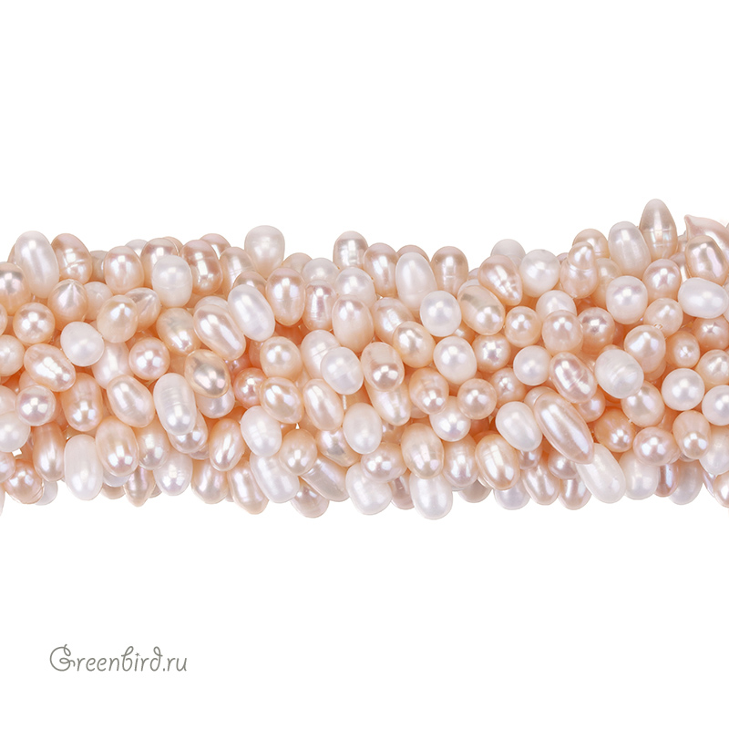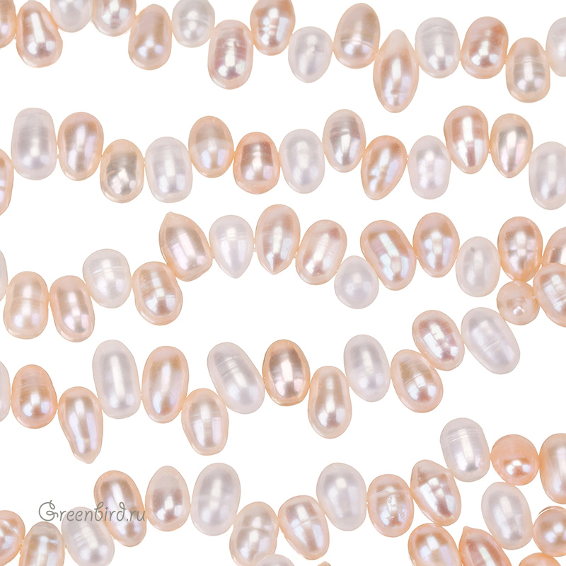 Жемчуг пресноводный культивированный (выращенный) со смещенным отверстием. "Рис", жемчуг овальной или удлиненной формы, вытянутый вдоль отверстия. Может иметь "поясок" или несколько, также обычно имеет заметные поперечные полоски. Размер примерно 9 х 5,7 мм, отверстие: 0,5-0,6 мм. Цвет: двухцветный (молочный и персиковый. Из-за природных особенностей материала оттенки жемчужин могут незначительно отличаться. Цена указана за нить (примерно 65 штук).