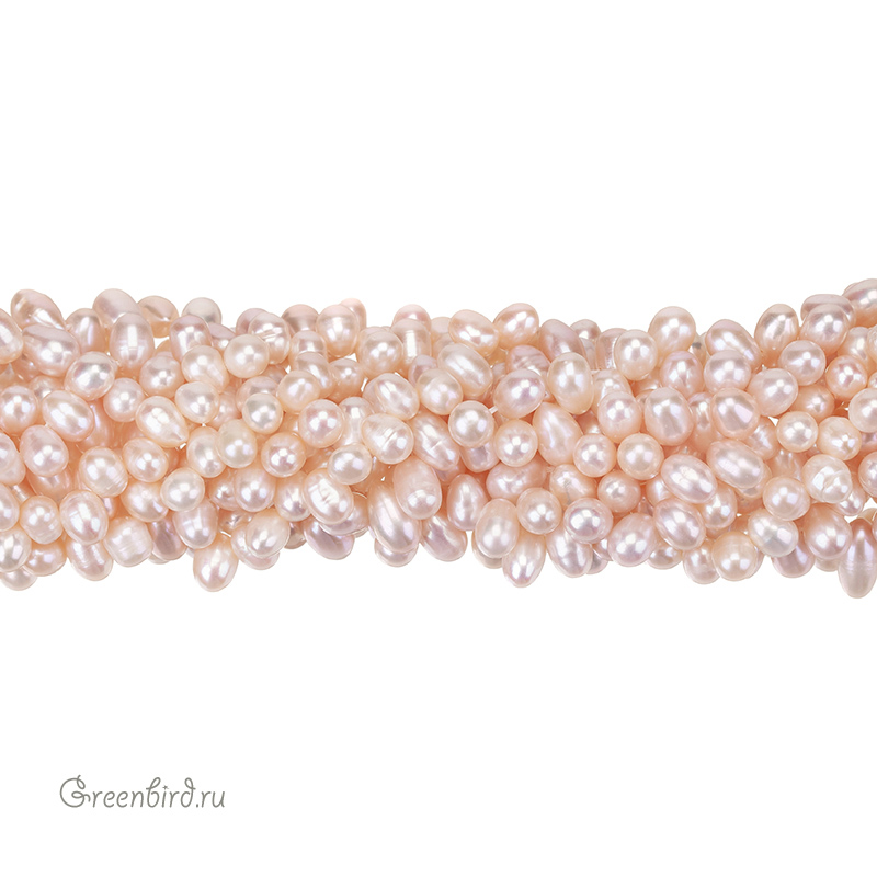 Жемчуг пресноводный культивированный (выращенный) со смещенным отверстием. "Рис", жемчуг овальной или удлиненной формы, вытянутый вдоль отверстия. Может иметь "поясок" или несколько, также обычно имеет заметные поперечные полоски. Размер примерно 7 х 5,5 мм, отверстие: 0,5-0,6 мм. Цвет: светло-персиковый или персиково-розовый. Из-за природных особенностей материала оттенки жемчужин могут незначительно отличаться. Цена указана за нить (примерно 80 штук).