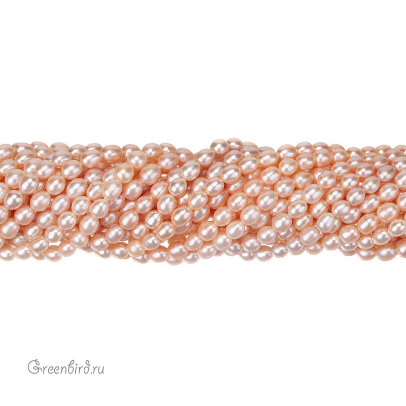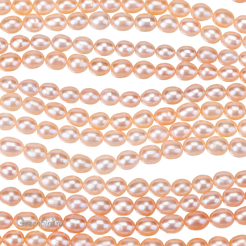 Жемчуг пресноводный культивированный (выращенный). "Рис", жемчуг овальной или удлиненной формы, вытянутый вдоль отверстия. Данный сорт отличается гладкой поверхностью, характерные пояски практически не заметны. Средний размер: 6 х 5 мм, отверстие: 0,5-0,7 мм. Цвет: персиковый или персиково-розовый. Из-за природных особенностей материала размеры и оттенки жемчужин могут незначительно отличаться. Цена указана за нить (примерно 60 штук).