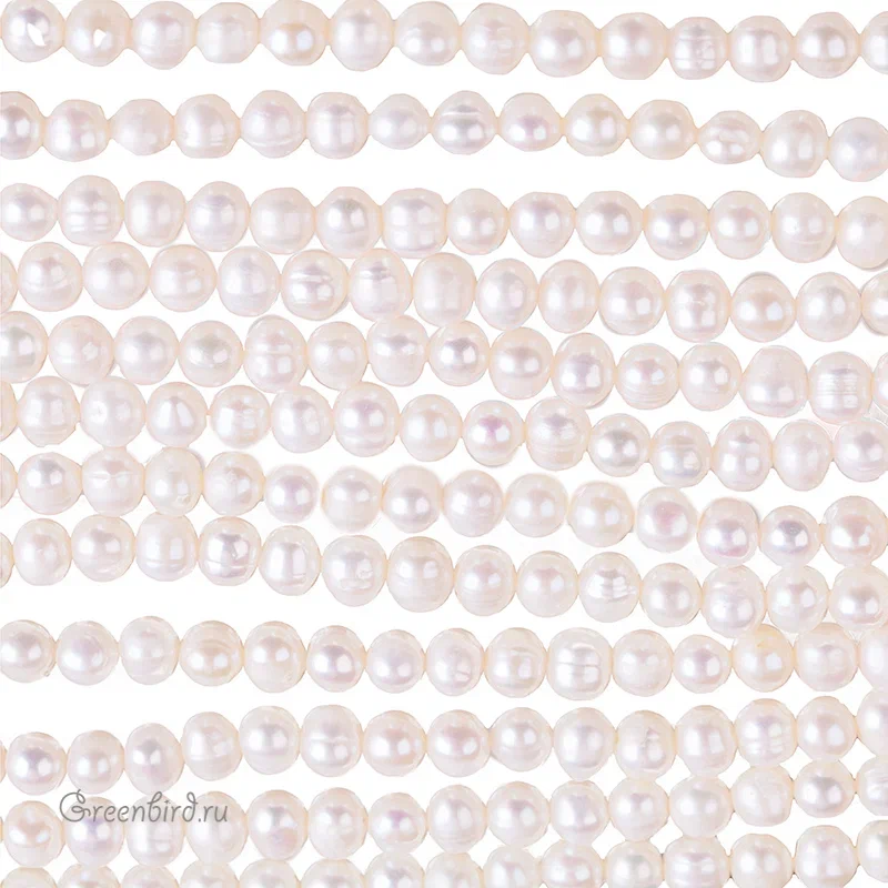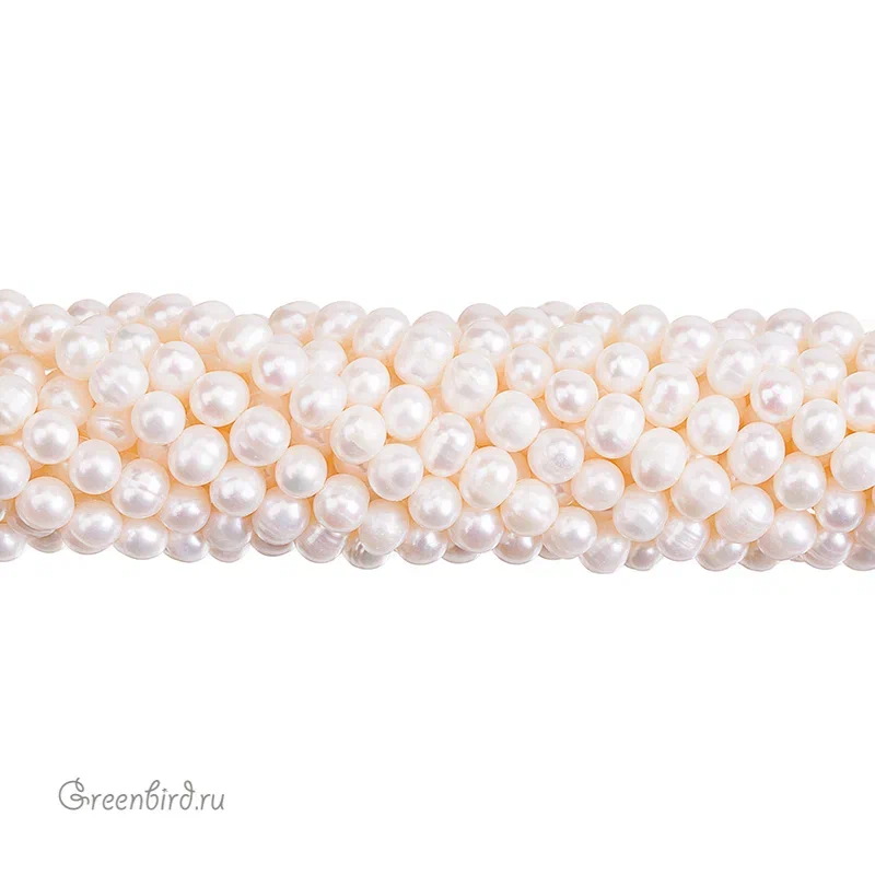 Жемчуг пресноводный культивированный (выращенный). Классическая форма пресноводного жемчуга - почти круглый, овальный или яйцевидный, слегка сплюснутый вдоль отверстия, с характерным "пояском" или небольшими наплывами. Средний размер: 7 х 6 мм, отверстие: 0,5 - 0,6 мм. Форма в основном яйцевидная. Цвет: натуральный жемчужный, нежно-кремовый. Из-за природных особенностей материала размеры и оттенки жемчужин могут отличаться. Цена указана за нить (примерно 60 - 63 шт., всего 35 - 36 см).