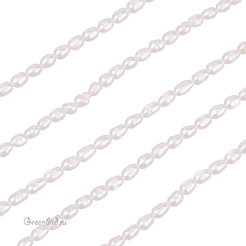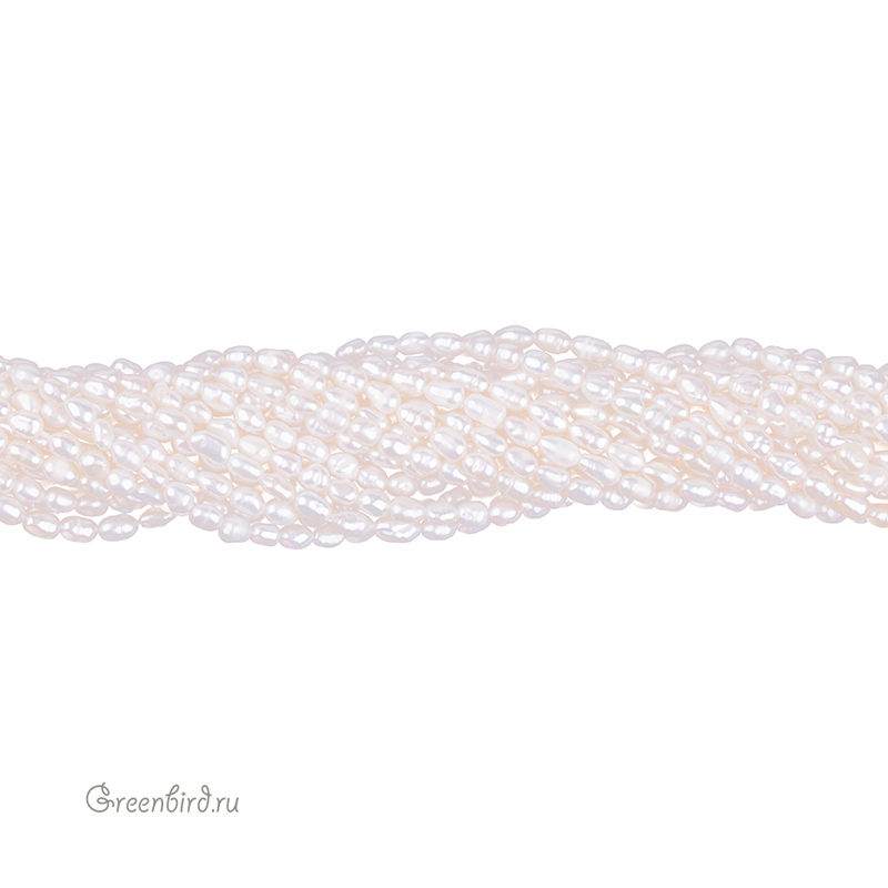 Жемчуг пресноводный культивированный (выращенный). "Рис", жемчуг овальной или удлиненной формы, вытянутый вдоль отверстия. Может иметь "поясок" или несколько, также обычно имеет заметные поперечные полоски. Средний размер: 4,5 х 3,5 мм (в длину примерно 4,3-4,8 мм, редко до 5 мм, толщина от 3,0 до 3,8 мм), отверстие: 0,5-0,7 мм. Цвет: молочный, светло-кремовый, кремовый, топленое молоко, редко жемчужно-белый. Из-за природных особенностей материала размеры и оттенки жемчужин могут незначительно отличаться. Цена указана за нить (примерно 80 штук).