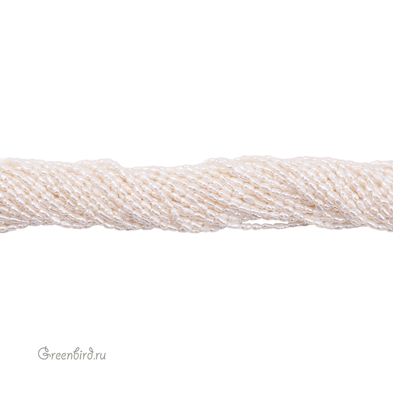 Жемчуг пресноводный культивированный (выращенный). "Рис", жемчуг овальной или удлиненной формы, вытянутый вдоль отверстия. Может иметь "поясок" или несколько, также обычно имеет заметные поперечные полоски. Средний размер: 5 х 3 мм (в длину примерно 4-5 мм, редко до 6 мм, толщина от 2,5 до 3 мм), отверстие: 0,5-0,7 мм. Цвет: молочный, светло-кремовый, кремовый, топленое молоко, редко жемчужно-белый. Из-за природных особенностей материала размеры и оттенки жемчужин могут незначительно отличаться. Цена указана за нить (примерно 82-85 штук).