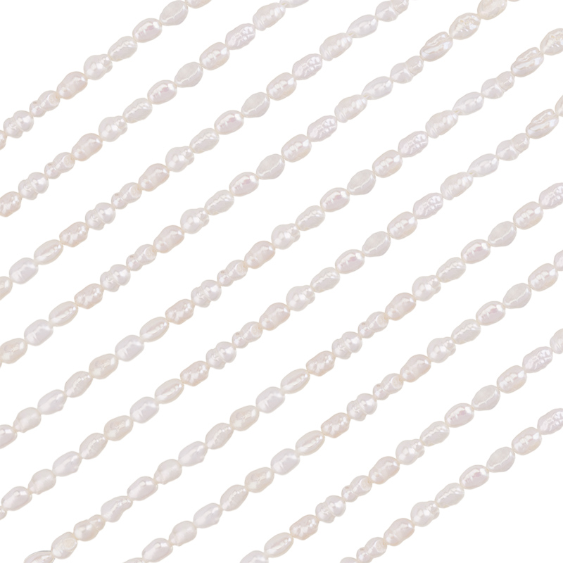 Форма бусин: "Рис" – неоднородные овальные или удлинённые жемчужины, вытянутые вдоль отверстия. Могут иметь один или несколько "поясков", а также характерные поперечные полосы. Средний размер: 6 × 4 мм, диаметр отверстия: 0,8 мм. Цвет: натуральный жемчужный, золотисто-кремовый.