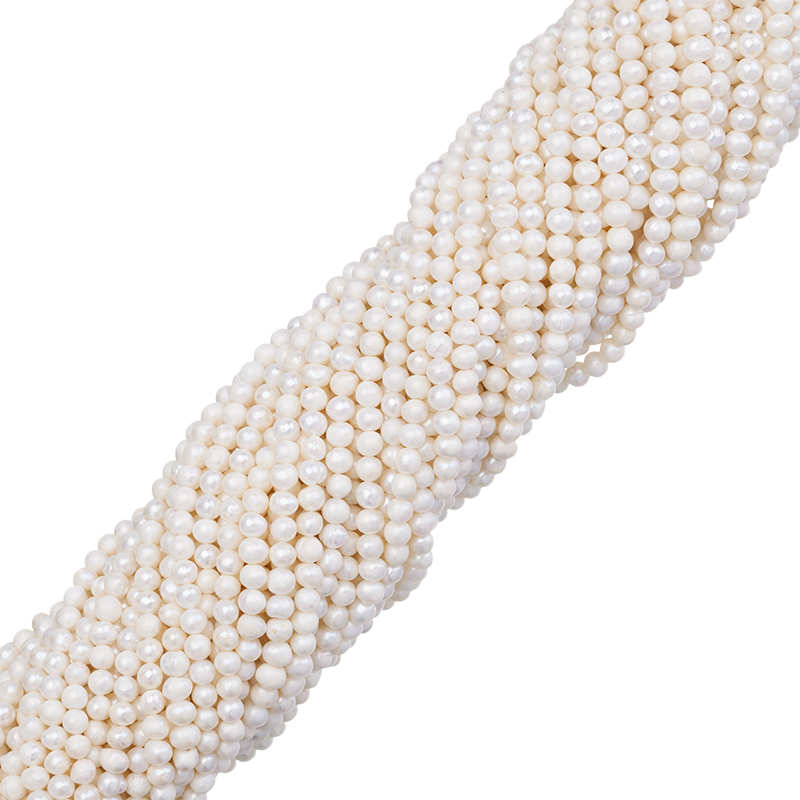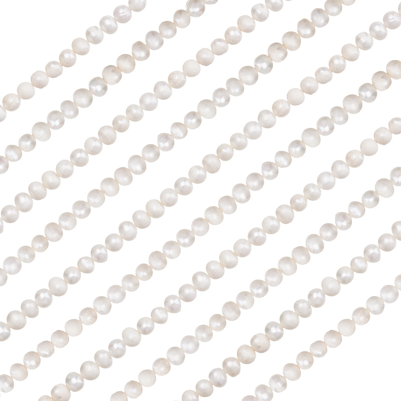 Жемчуг пресноводный культивированный (выращенный). Большинство бусин в нити с матовой, бархатистой поверхностью. Такой жемчуг ценится дизайнерами за его органичные, природные, неидеальные формы и фактуры. Он выглядит более современно и неформально по сравнению с классическим круглым жемчугом.