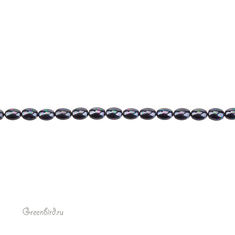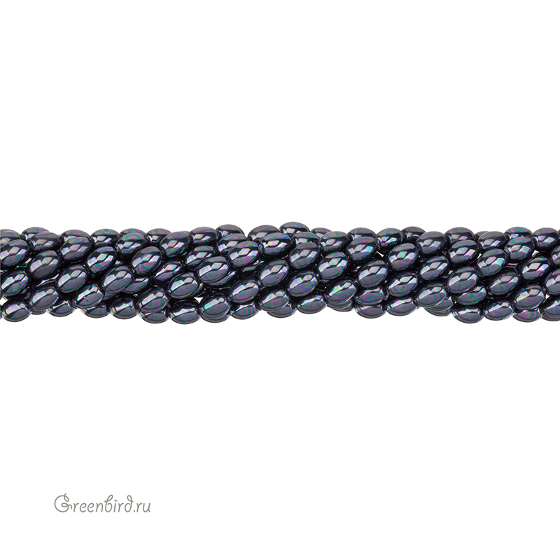 Искусственный жемчуг "Майорка" в форме риса. Жемчуг овальной или удлиненной формы, вытянутый вдоль отверстия. Материал: кристальная бусина-основа, покрытая цветным слоем. Цвет: черный с переливающимся покрытием. Размер: 7 - 7,3 х 5,5 мм, отверстие: 0,6 мм. Цена указана за нить 37-39 см (примерно 54 штуки).