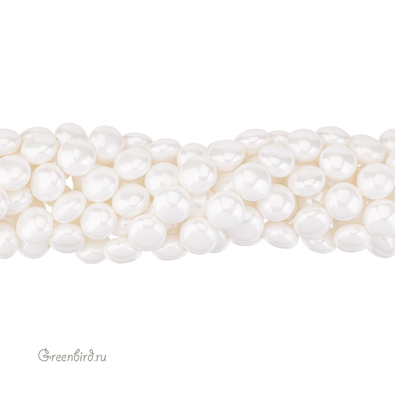 Искусственный жемчуг "Майорка". Форма - круглая плоская, "таблетка". Материал: кристальная бусина-основа, покрытая цветным слоем. Размер: 14 мм, толщина: 10 мм, отверстие: 1,4 мм. Цвет: белый. Цена указана за нить 37-39 см (26-28 штук).