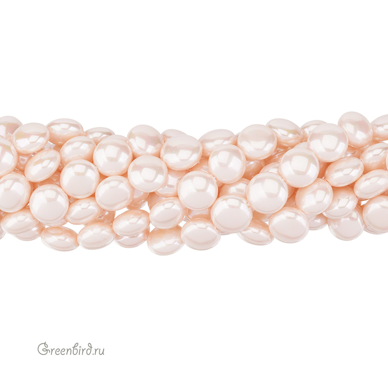 Искусственный жемчуг "Майорка". Форма - круглая плоская, "таблетка". Материал: кристальная бусина-основа, покрытая цветным слоем. Размер: 14 мм, толщина: 10 мм, отверстие: 1,4 мм. Цвет: персиковый. Цена указана за нить 37-39 см (26-28 штук).