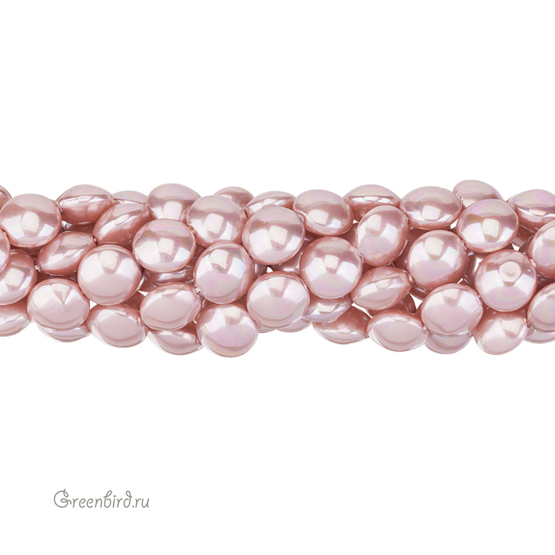 Искусственный жемчуг "Майорка". Форма - круглая плоская, "таблетка". Материал: кристальная бусина-основа, покрытая цветным слоем. Размер: 14 мм, толщина: 10 мм, отверстие: 1,4 мм. Цвет: сиреневый. Цена указана за нить 37-39 см (26-28 штук).