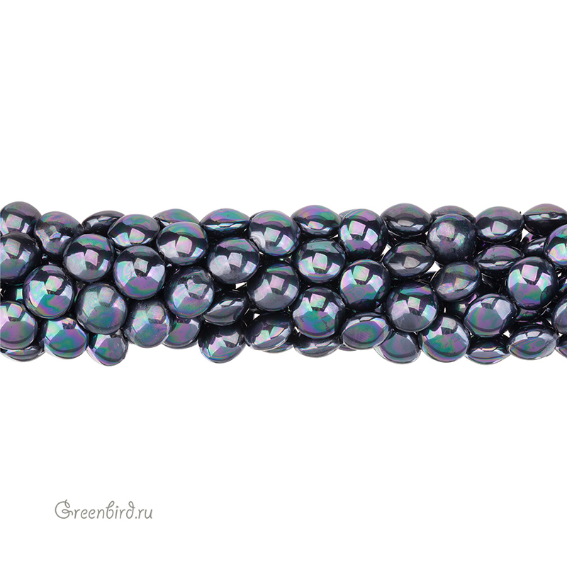 Искусственный жемчуг "Майорка". Форма - круглая плоская, "таблетка". Материал: кристальная бусина-основа, покрытая цветным слоем. Размер: 12 x 12 мм, толщина: 8 мм, отверстие: 1 мм. Цвет: черный с переливающимся покрытием. Цена указана за нить 37-39 см (примерно 30-34 штуки).