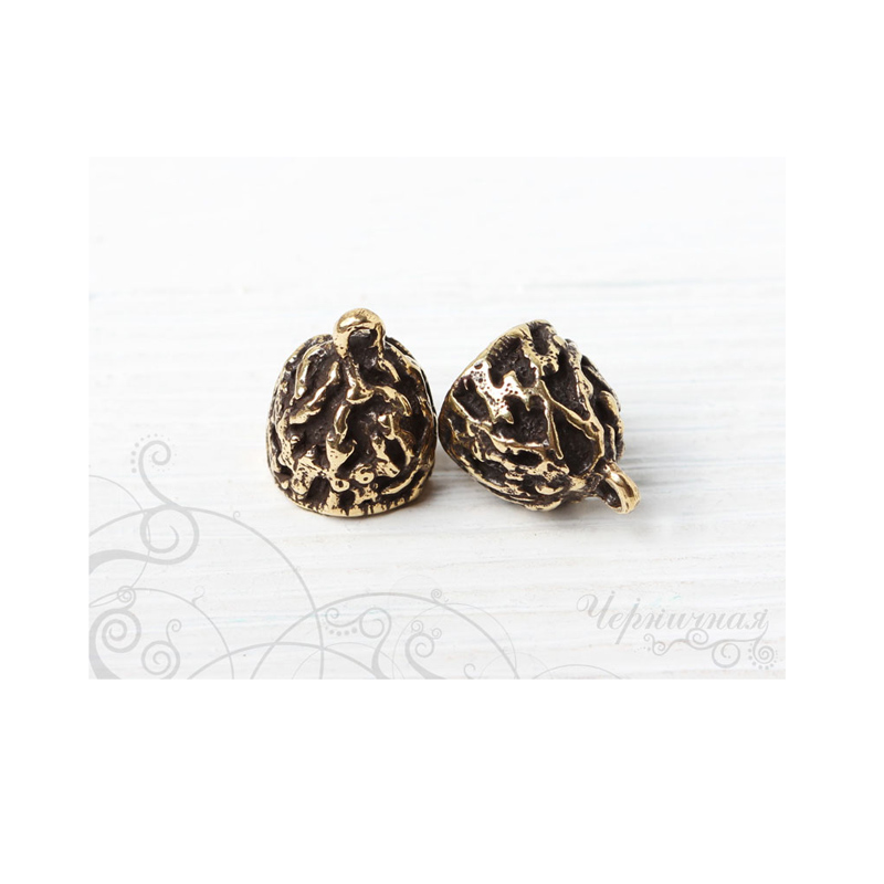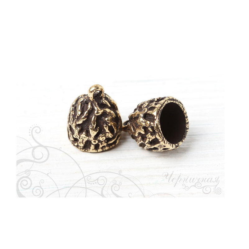 Авторская фурнитура Анны Черных - концевик для вклейки шнуров или лент. Размер: 12,2 х 14,9 мм, внутренний диаметр: 8,8 мм, глубина примерно 9,3 мм, петля: 1,5-1,6 мм. Материал: античная латунь. Производство: Россия. Цена указана за 1 шт.