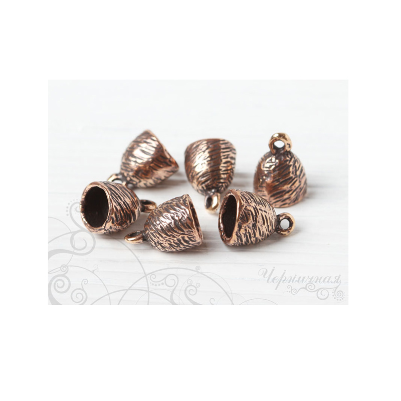 Авторская фурнитура Анны Черных - концевик для вклейки шнуров или лент. Размер: 9,6 х 13 мм, внутренний диаметр: 6,9 мм, глубина примерно 6,1 мм, петля: 1,3-1,5 мм. Материал: античная бронза. Производство: Россия. Цена указана за 1 шт.