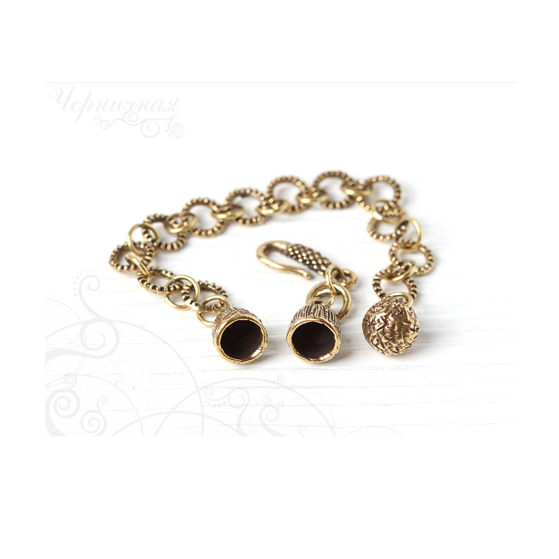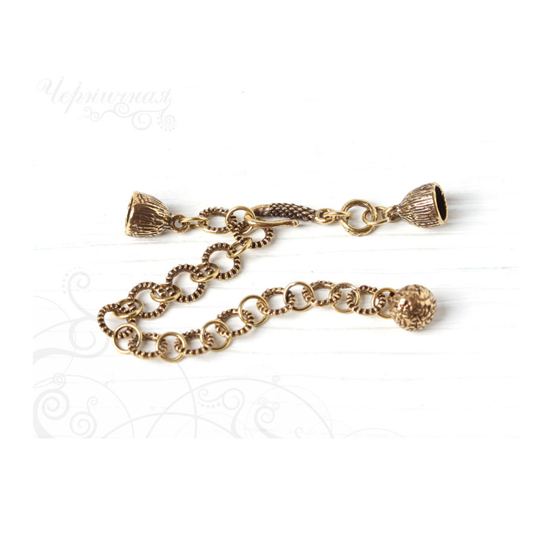 Авторская фурнитура Анны Черных - замок-крючок с концевиками для вклеивания шнуров и с удлинителем. Концевики: 8,3 х 12,1 мм, внутренний размер примерно 6,3 мм; крючок: 16,9 х 7,5 мм; звенья цепочек: 7 мм (ширина 1,5 мм, толщина 1,3 мм) и 5,7 мм (толщина звена 0,8 мм), длина цепочки удлинителя: 10,6 см; подвеска: 10,3 х 8,5 мм; общая длина элементов: 12,7 см и 3,7 см. Длина в застегнутом состоянии от 5,3 см до 16,1 см. Материал: античная латунь. Производство: Россия. Цена указана за 1 шт.