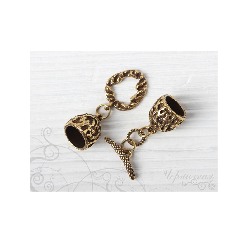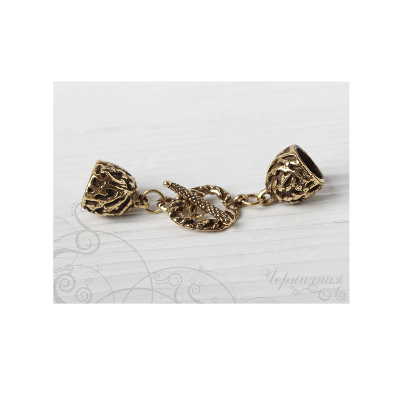 Авторская фурнитура Анны Черных - замок-тоггл с концевиками для вклеивания жгута. Тоггл: 14,5 х 18,9 мм, отверстие: 8,3 х 10,8 мм, палочка: 19,8 х 4,9 мм; концевики: 12,2 х 15 мм, внутренний диаметр: 8,5 мм, глубина примерно 9,8 мм. Общая длина (не регулируется): 5,8 см. Материал: античная латунь. Производство: Россия. Цена указана за 1 шт.
