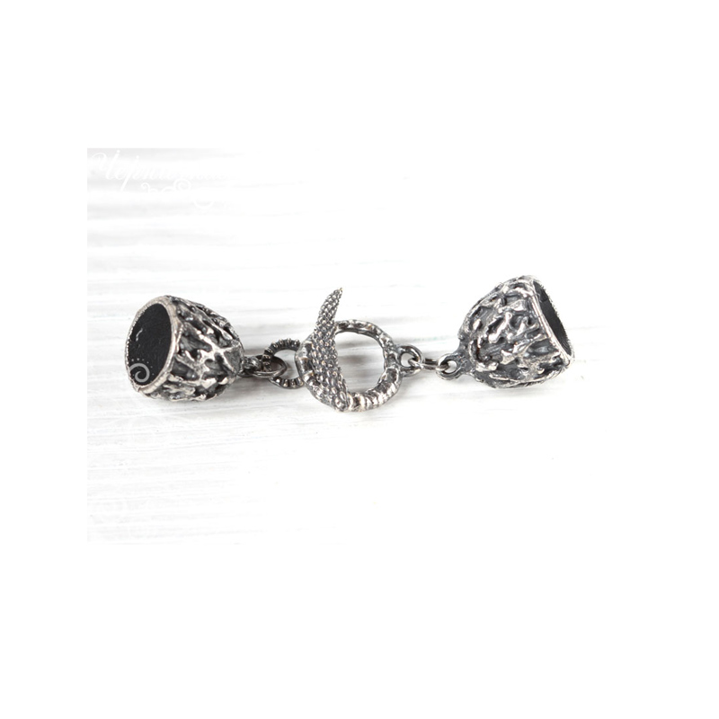 Авторская фурнитура Анны Черных - замок-тоггл с концевиками для вклеивания жгута. Тоггл: 14,5 х 18,9 мм, отверстие: 8,3 х 10,8 мм, палочка: 19,8 х 4,9 мм; концевики: 12,2 х 15 мм, внутренний диаметр: 8,5 мм, глубина примерно 9,8 мм. Общая длина (не регулируется): 5,8 см. Материал: латунь, покрытие: античное серебро. Производство: Россия. Цена указана за 1 шт.