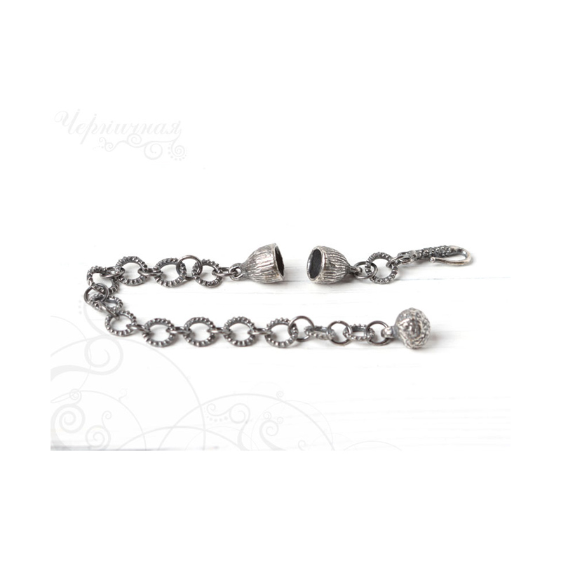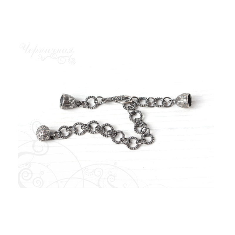 Авторская фурнитура Анны Черных - замок-крючок с концевиками для вклеивания шнуров и с удлинителем. Концевики: 8,3 х 12,1 мм, внутренний размер примерно 6,3 мм; крючок: 16,9 х 7,5 мм; звенья цепочек: 7 мм (ширина 1,5 мм, толщина 1,3 мм) и 5,7 мм (толщина звена 0,8 мм), длина цепочки удлинителя: 10,6 см; подвеска: 10,3 х 8,5 мм; общая длина элементов: 12,7 см и 3,7 см. Длина в застегнутом состоянии от 5,3 см до 16,1 см. Материал: латунь, покрытие: античное серебро. Производство: Россия. Цена указана за 1 шт.